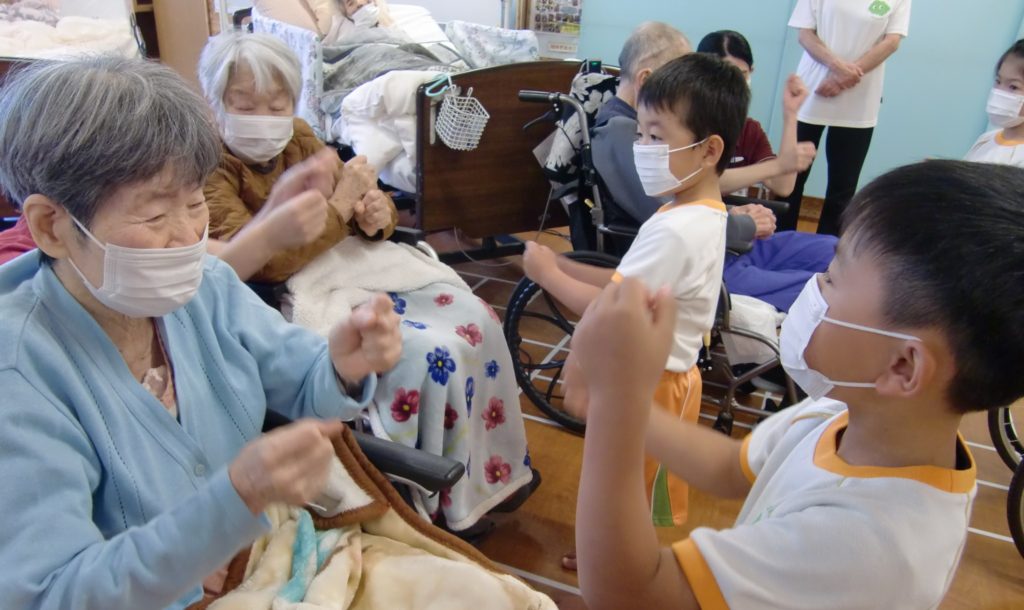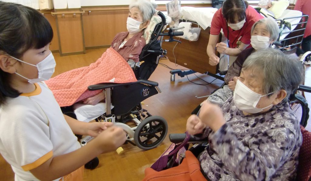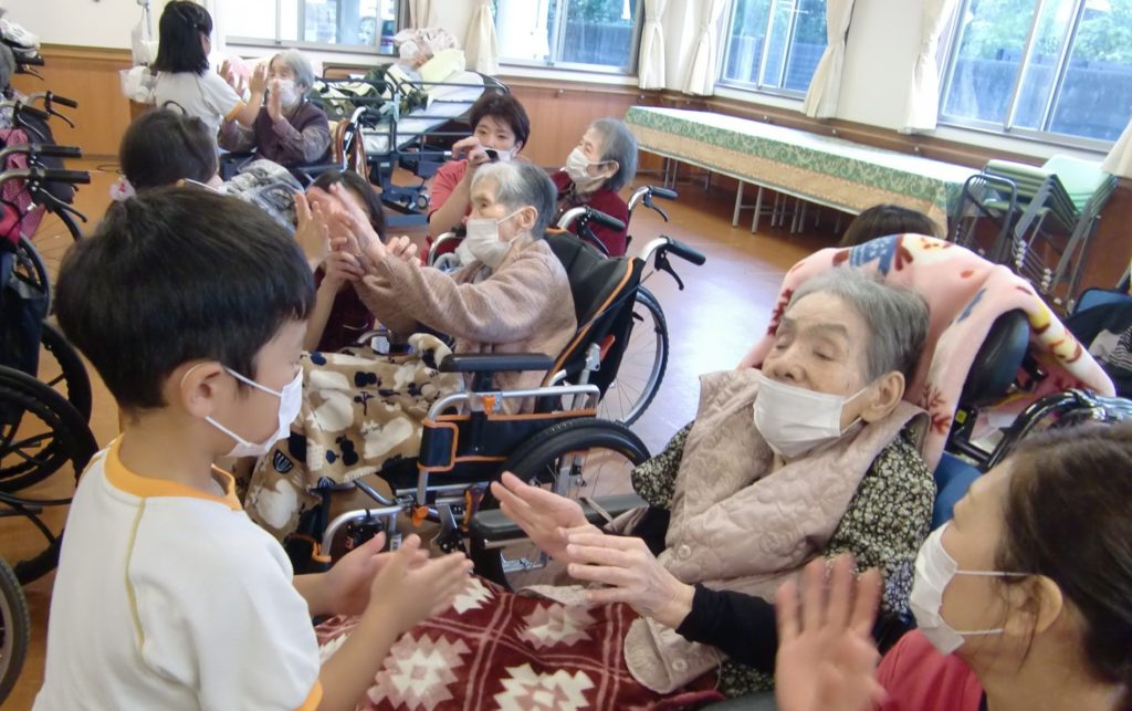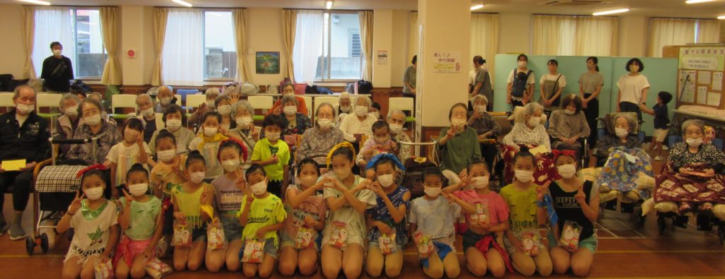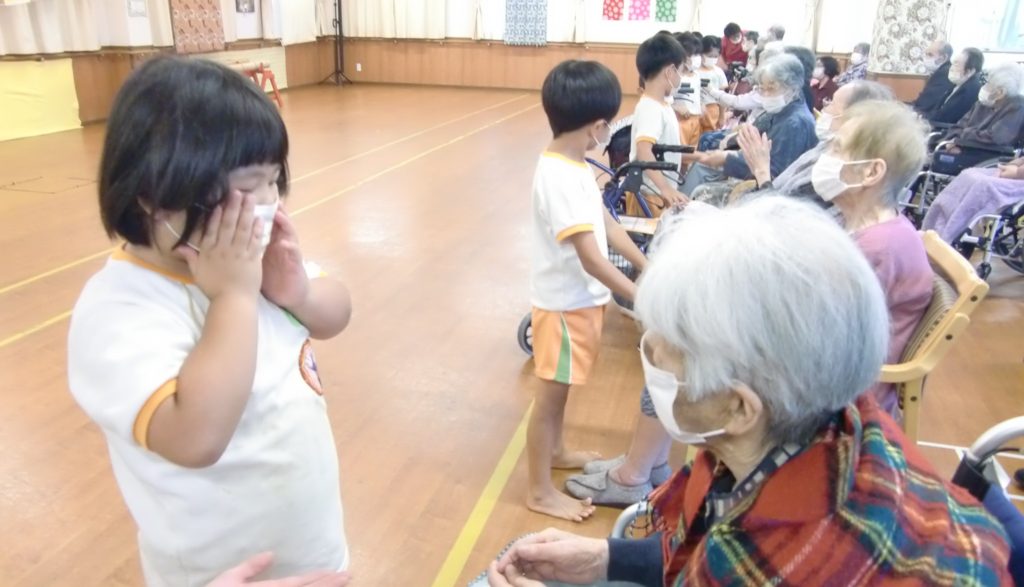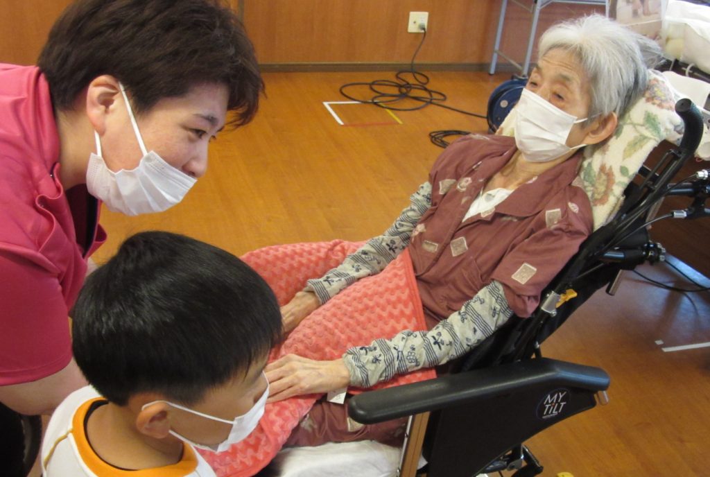 子供の若さ、パワーは励みになります。自ずと皆様、笑顔になっていました。手を触り、「しわがないね」のポロリ…。「私も昔は陸上の選手だった」など若かりし頃のエピソード多数(笑)
