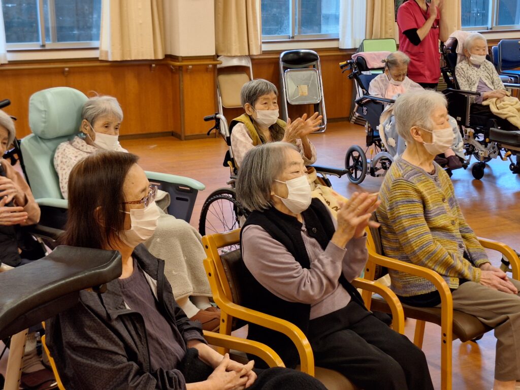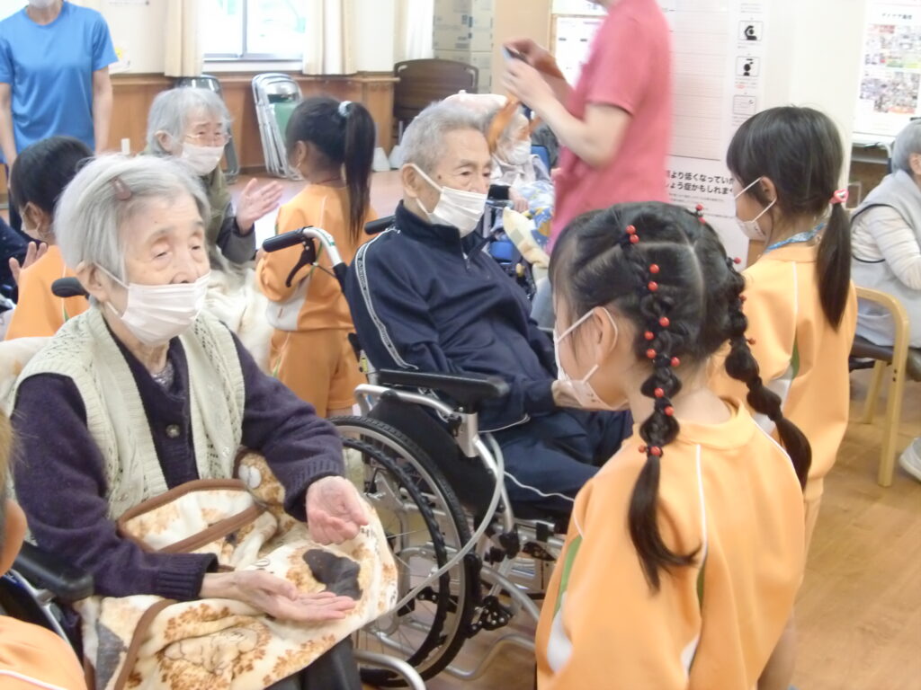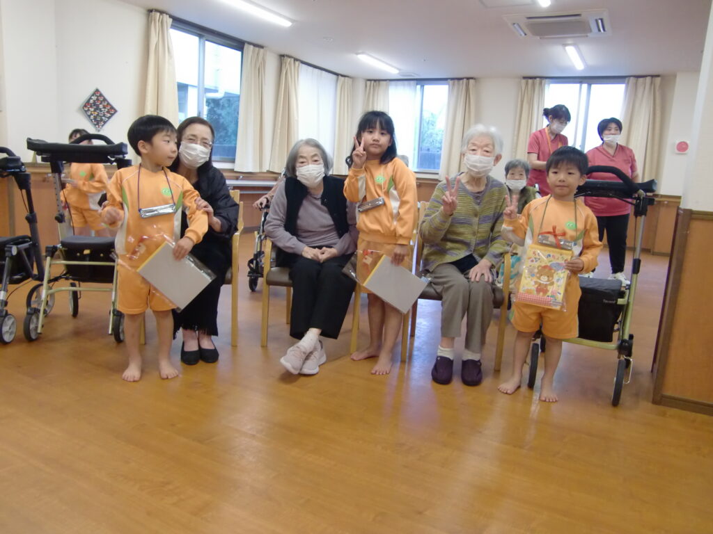 浄蓮寺保育園児 慰問に来て頂きました 「元気やね」「かわいいね」「転んでも骨は折れんのやろうね….」 子供の姿にはいつも元気を貰えます。 普段、あまり表情のない方も顔の表情が緩まれ、笑顔になられていました。