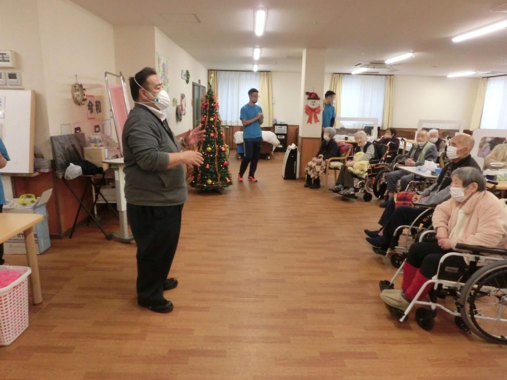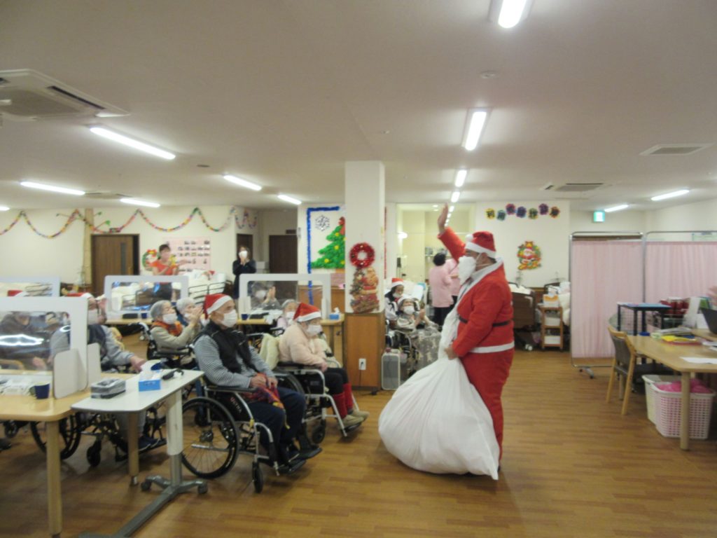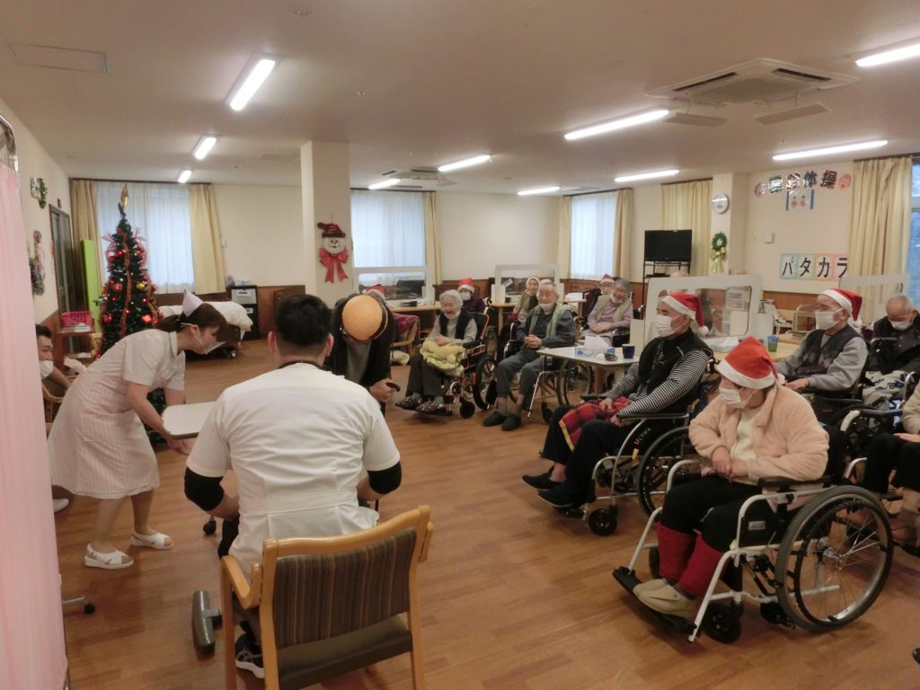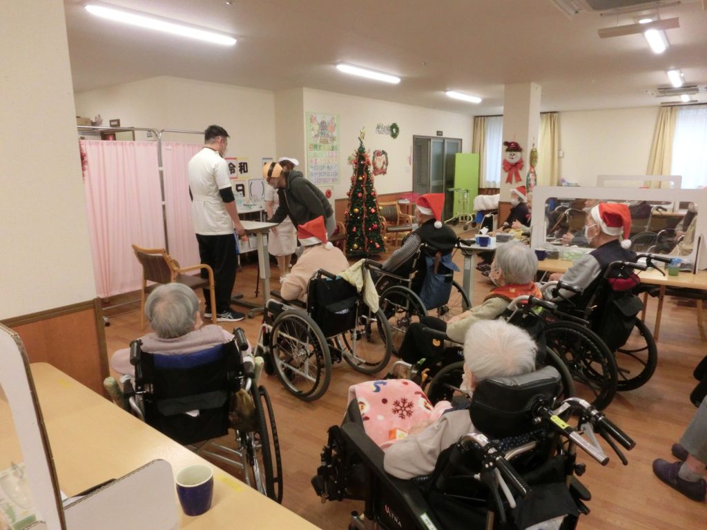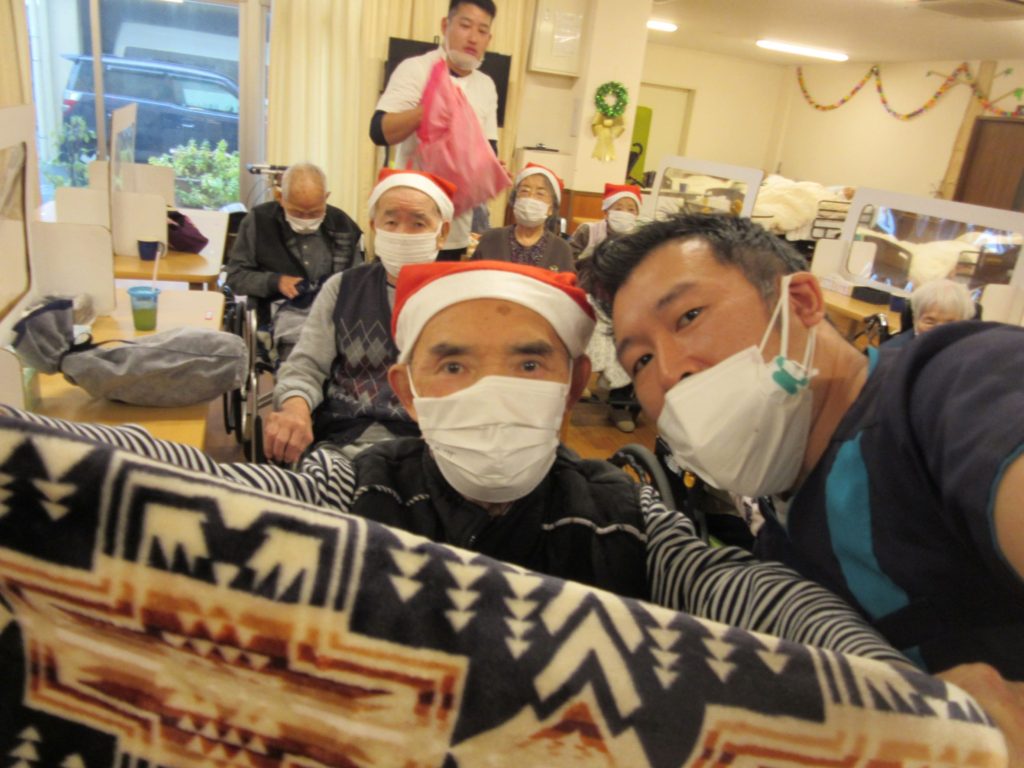 「クリスマス会」開催(‘◇’)ゞ 本日、クリスマス会をしましたヽ(^o^)丿 「はじめの挨拶」です! 「職員の寸劇」はたして… 「受け」は、良いようです! クライマックス!! 迫真の演技で、盛り上がりは「最高潮!」 「記念撮影」の様子 喜んでもらえて良かった(^o^) 「太り過ぎのサンタクロース」が登場しました! 皆さんに「ひざ掛け」のプレゼントヽ(^o^)丿 寒い冬を乗り越えましょう! 最後は「クリスマスケーキ」を美味しくいただきました(‘◇’)ゞ 最高の笑顔に癒されますヽ(^o^)丿
