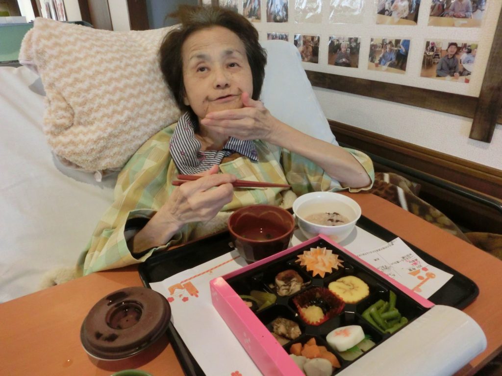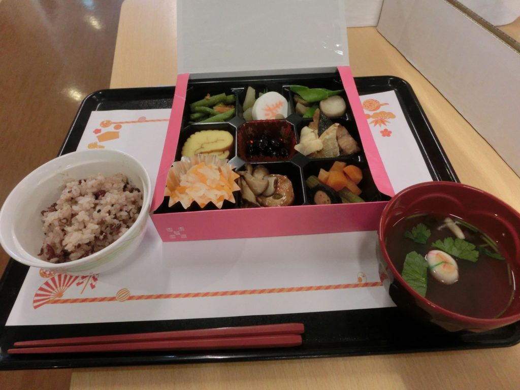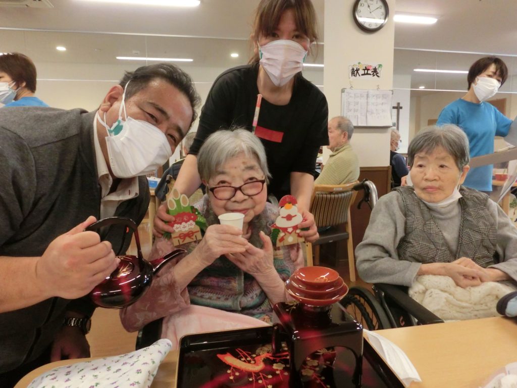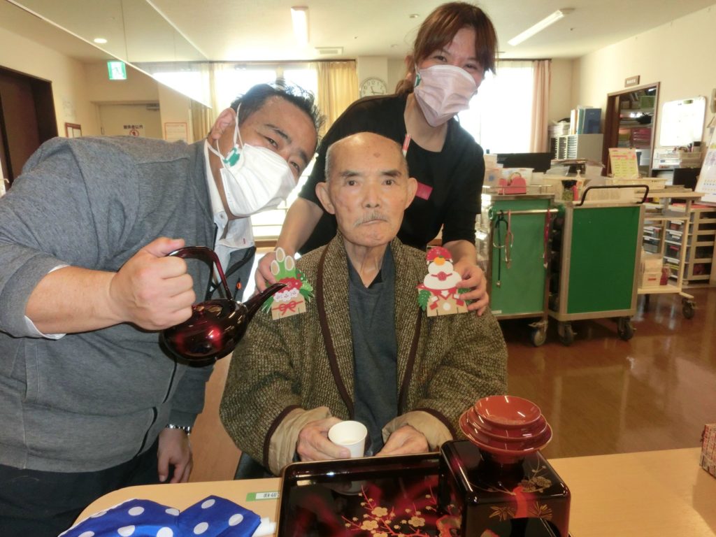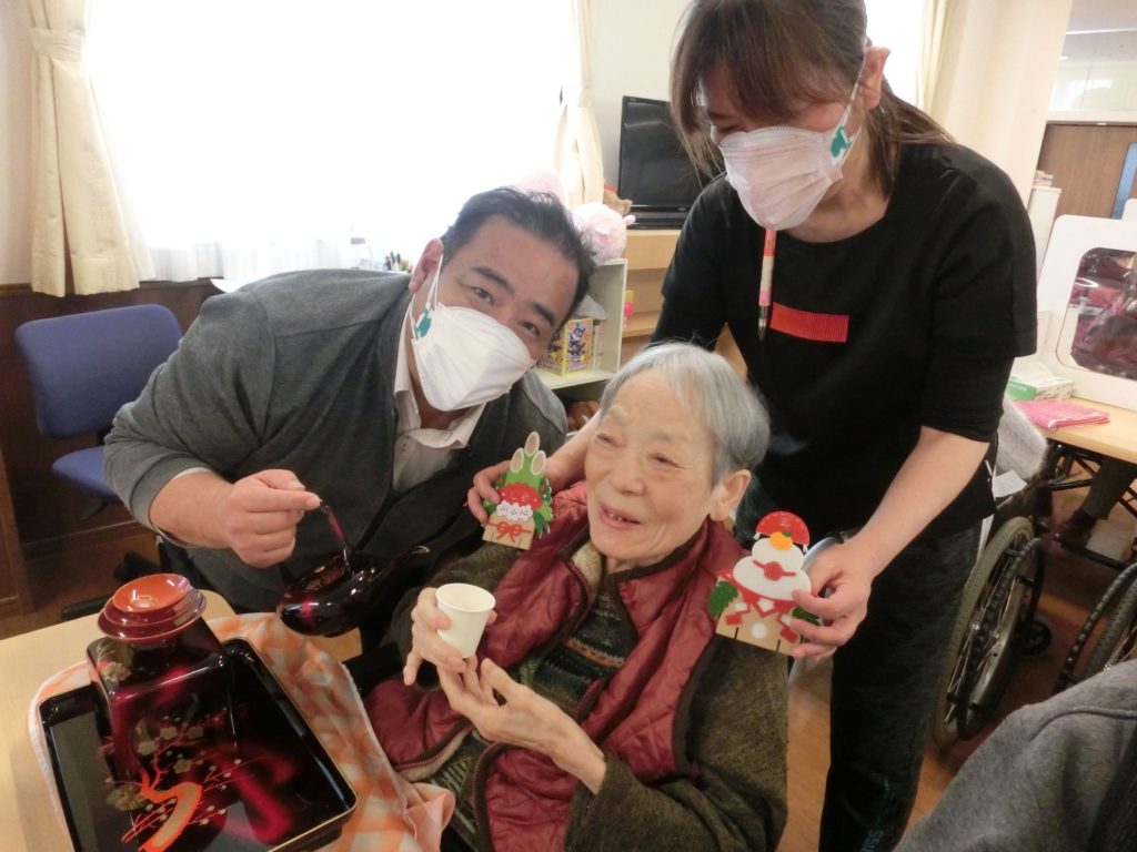 正月を味わっていただくため「お屠蘇」と「おせち料理」を振舞いました。